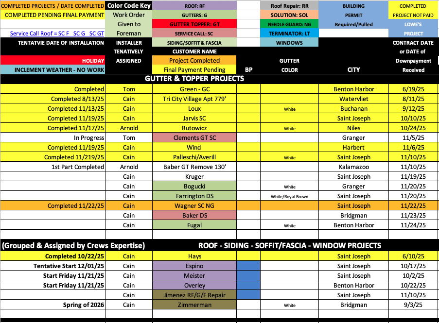 - We install our projects on a First-Sold-First-Installed basis according to this list taking into account a homeowners personal schedule as we require homeowners or their designee be home to review the completed work to ensure customer satisfaction and tender the final payment.