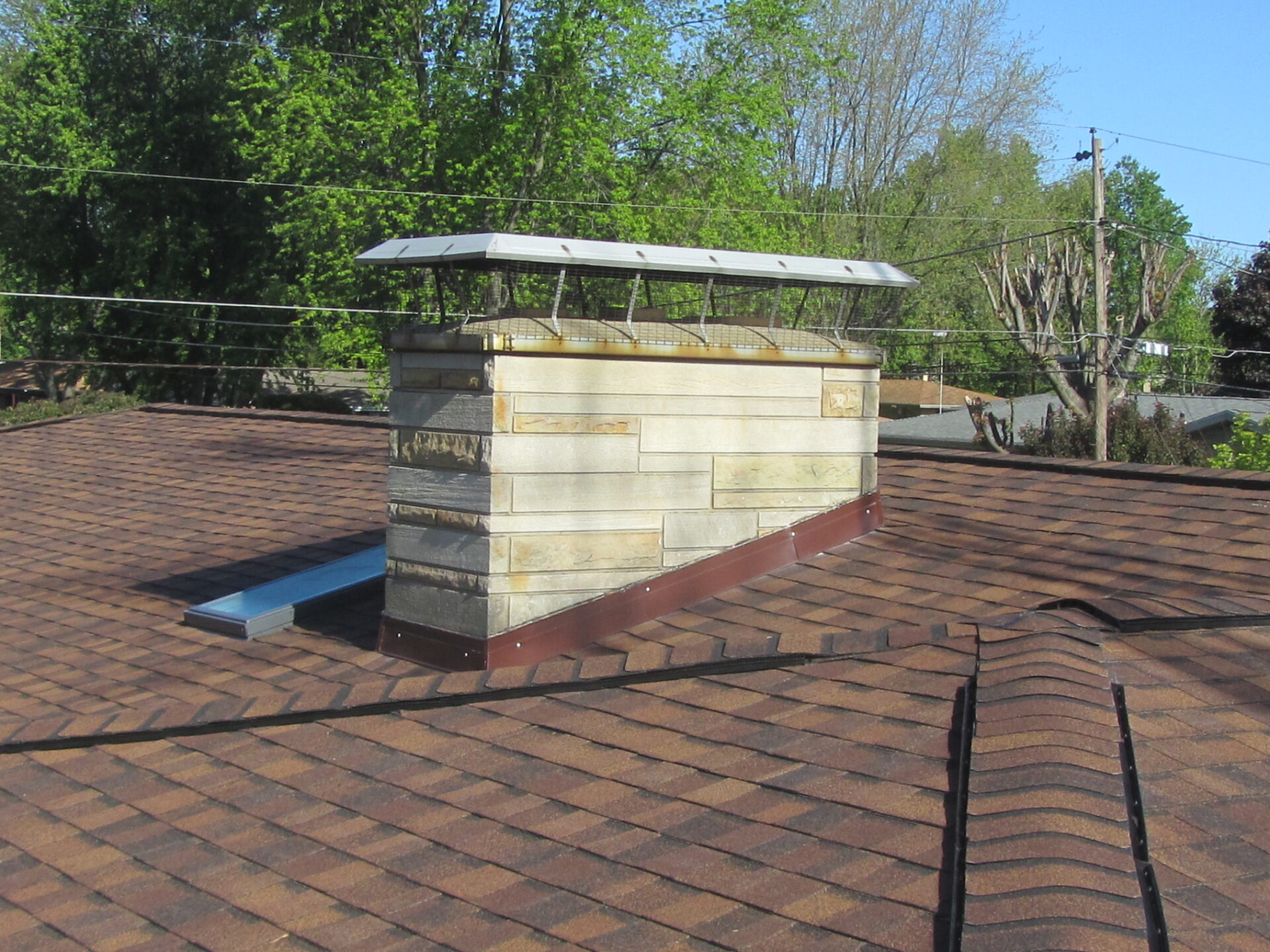 - We install a cricket or saddle behind the chimney in order to properly drain water around the chimney and to prohibit water from ponding behind it.
