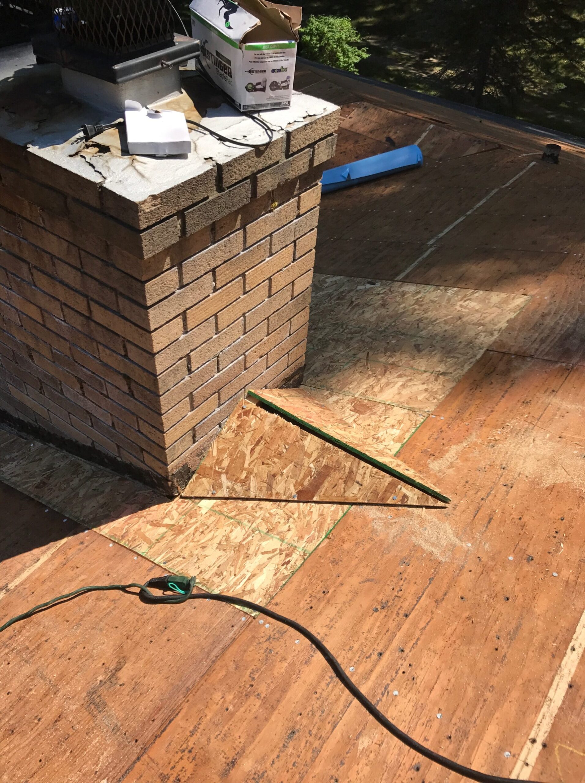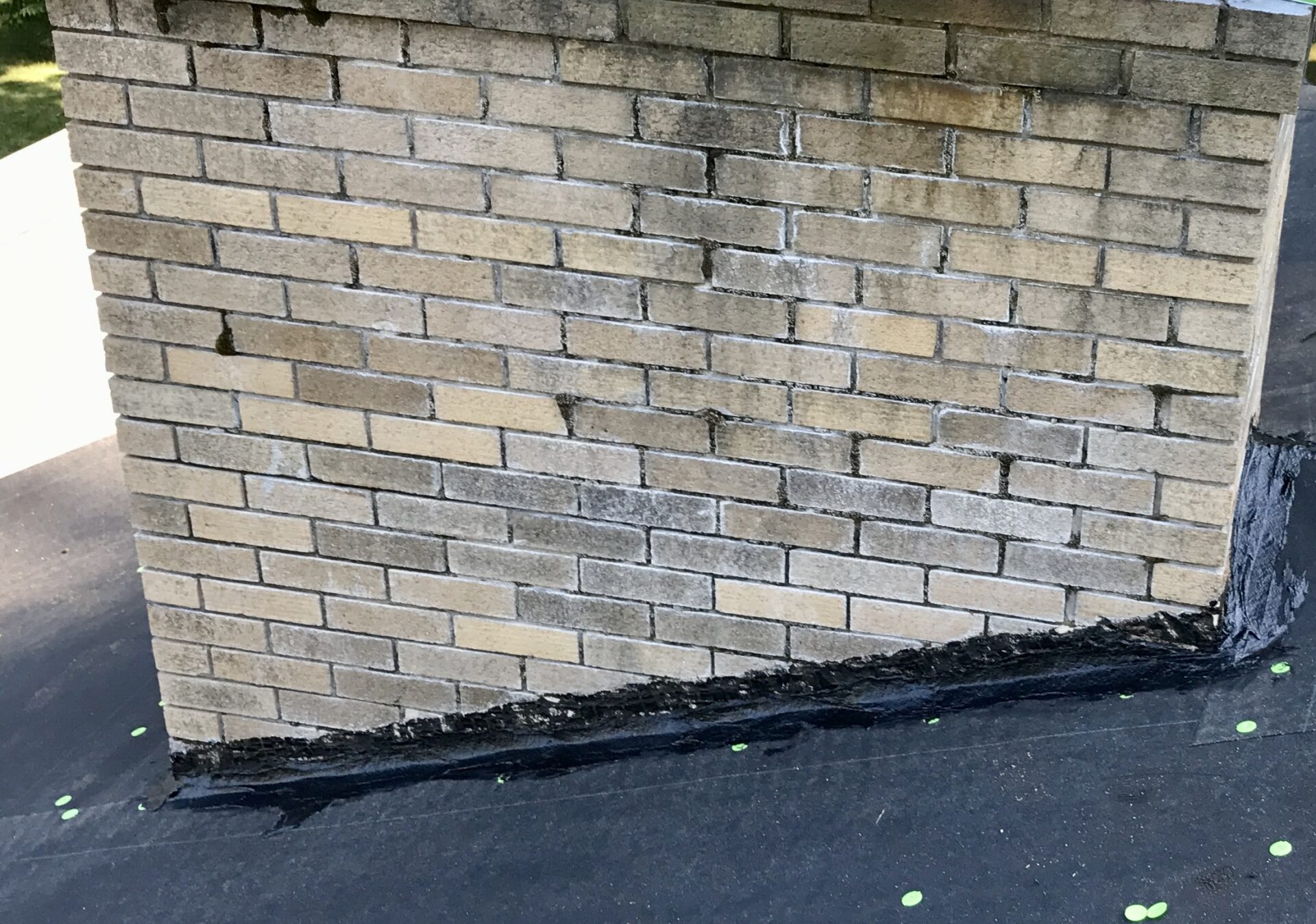 - High-Grade roofing cement was then applied on top of the waterproof underlayment including up on the wall of the chimney.