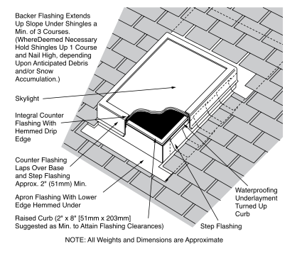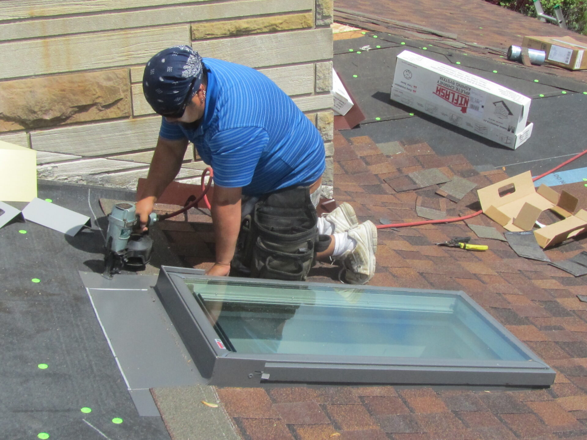 Most skylight manufacturer’s provide their own instructions for flashing their skylights. The sides of the skylight is flashed much like a chimney. We install waterproofing underlayment around the entire deck and bring the underlayment up onto the side walls of the skylight. Step flashing is installed on the sides; base flashing is installed upslope, holding one course of shingles away from the curb to encourage rain to wash away dirt and debris. The skylight itself provides the counter flashing or cap. Most new skylight have their own flashing kits. Dennison Exterior Solutions skylight installation methods provides 3 layers of flashing protection which includes waterproof underlayment.