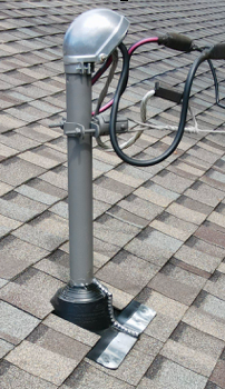 Practically all homes have circular vent pipes projecting through the roof that vent the plumbing inside the home. Before installing the soil pipe flashing boot, apply waterproof WinterGuard® around the penetration as follows: Cut a square piece of WinterGuard. Center the piece over the pipe’s top and cut an X into the WinterGuard slightly smaller than the inside diameter of the pipe’s opening. Remove the release film, then lower the WinterGuard around the pipe and seal it to the deck and underlayment. After that, install the shingles up to the vent pipe. Then cut a hole in the shingle that will go over the pipe and install the shingle setting it in asphalt plastic cement. This method diverts any water away from the roof penetration and out over the shingle. Next, place a preformed flashing flange, sized to fit snugly over the pipe, over the s vent pipe and set it in asphalt roofing cement. Be sure the flange is seated squarely on the roof.