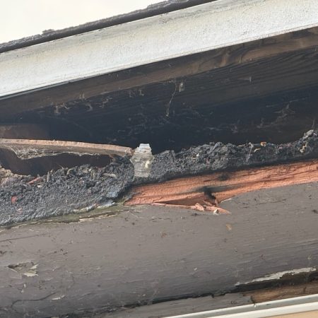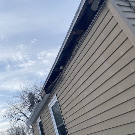 On this home in the winter of January 2026 during a prolonged period of below freezing temperatures huge ice dams about eight inches thick collapsed not only the gutter system but also destroyed the existing soffit and fascia boards. Ice dams can easily weight hundreds of pounds.